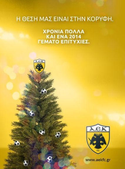 “Η θέση μας είναι στην κορυφή. Χρόνια Πολλά και ένα 2014 γεμάτο επιτυχίες”, εύχεται η Ένωση, ενώ μόνο τυχαίο δεν είναι το γεγονός ότι στην κορυφή του χριστουγεννιάτικου δέντρου της κάρτας καμαρώνει το λογότυπο της ΑΕΚ.
