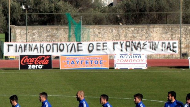 Οι φίλαθλοι της Σπάρτης επιθυμούν την επιστροφή του Δημήτρη Γιαννακόπουλου στο διοικητικό τιμόνι της ομάδας τους και για αυτό κρέμασαν σχετικό πανό στο ματς με τον Κισσαμικό (photos)