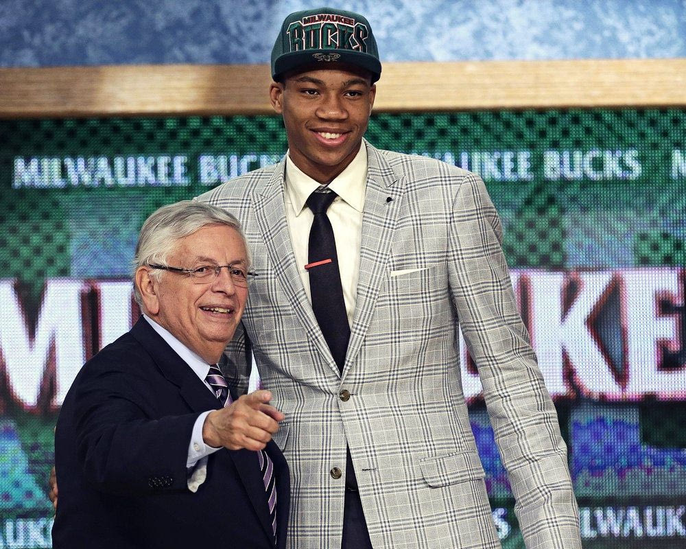Ο τότε κομισάριος του ΝΒΑ Ντέιβιντ Στερν με τον Γιάννη Αντετοκούνμπο μετά την επιλογή του στο NBA draft από τους Μπακς AP Photo/Kathy Willens