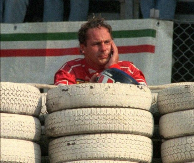 Gerhard Berger, of Austria, watches the race from behind protection tires after breaking the suspension of his Ferrari when he was in second position during the Grand Prix of Italy in Monza Sunday, Sept. 10, 1995. (Ap Photo/Luca Cattaneo) ASSOCIATED PRESS