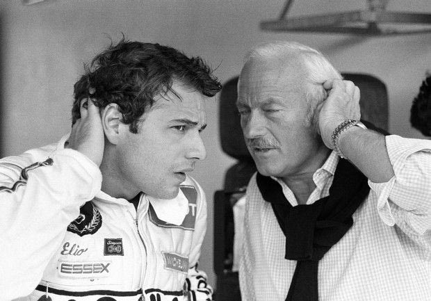 Lotus cars boss Colin Chapman (r) and young Italian Formula-1 driver Elio de Angelis are troubled by the roar of engines at the Jarama circuit in Madrid June 20, 1981 as they snatch a mid-trial snag solving discussion. De Angelis was fraction slower than Friday's trial time and dropped from 6th to 10th position for the start of the grand prix scheduled June 21. (AP Photo/Derek Ive) AP
