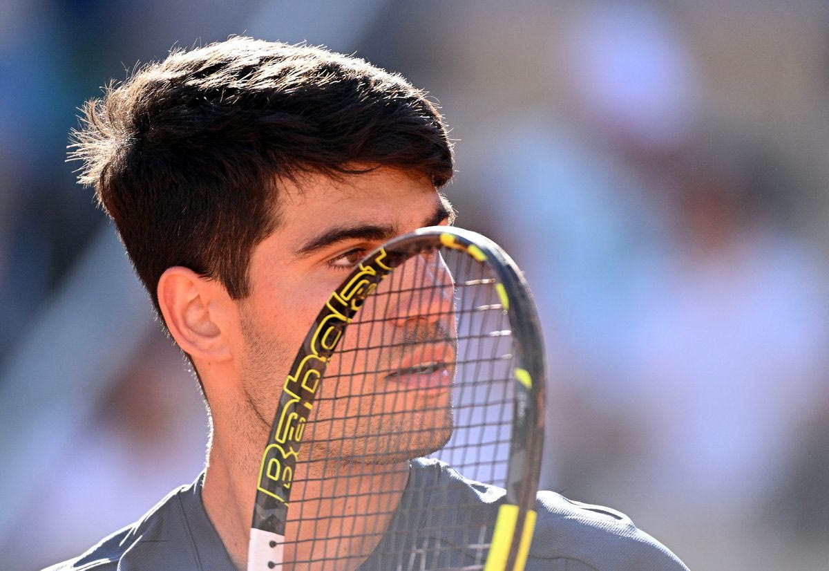 epa11395914 Carlos Alcaraz of Spain in action during his Mens Singles semi final match against Jannik Sinner of Italy during the French Open Grand Slam tennis tournament at Roland Garros in Paris, France, 07 June 2024. EPA/CAROLINE BLUMBERG