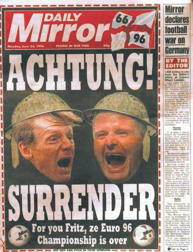 Το κλίμα του ματς το απεικόνιζαν με τον καλύτερο τρόπο τα βρετανικά ταμπλόιντ. Στην ιστορία έχει μείνει το πρωτοσέλιδο της Mirror, που είχε βάλει δυο βρετανικά κράνη πάνω στα κεφάλια των Σέρινχαμ και Γκασγκόιν με καταπληκτικό γερμανοαγγλικό τίτλο “Achtung Surrender” (Κίνδυνος! Παραδοθείτε) και ακόμη πιο γραφικό υπότιτλο: “Για σας φρίτσηδες το Euro 96 τελειώνει”