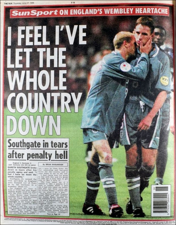Όπως ήταν φυσικό όλα τα φώτα έπεσαν πάνω στον Γκάρεθ Σαουθγκέιτ, που έχασε το πέναλτι. Οι περισσότεροι προσπαθούσαν να του δώσουν κουράγιο, η ψυχούλα τους όμως το ήξερε. Και του 25χρονου τότε Σαουθγκέιτ επίσης: “Δεν θα πρέπει αν αισθάνεσαι ένοχος…” ήταν το μήνυμα του τότε πρωθυπουργού Τζον Μέιτζορ, αλλά ο ίδιος δήλωνε ότι ένιωθε πως είχε απογοητεύσει ένα ολόκληρο έθνος