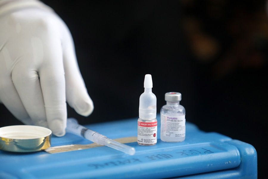 epa08287932 A nurse from Banda Aceh township public health department prepares vaccine injection for children during a regular vaccination in Banda Aceh, Indonesia, 12 March 2020. Nurses and health officials used the vaccination campaign to provide information to families about the coronavirus pandemic, instructing people on simple routines that could help prevent the spread of Covid-19. EPA/HOTLI SIMANJUNTAK