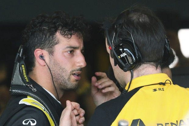 Renault driver Daniel Ricciardo of Australia, left, talks with a crew member after retiring from the Formula 1 Australian Grand Prix in Melbourne, Sunday, March 17, 2019. (Asanka Brendon Ratnayake/Pool via AP) AP