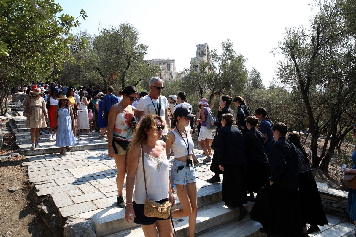 epa10128771 Tourists queue to visit the archaeological site of the Acropolis of Athens, Greece, 19 August 2022. According to the Greek Culture Ministry, the Acropolis was visited by more than 16,000 people per day in the summer of 2022. EPA/ALEXANDROS BELTES