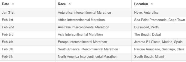 Ο αφέτης έδωσε το σήμα την τελευταία ημέρα του Ιανουαρίου στο Νόβο της Ανταρκτικής και η συνέχεια βρήκε τους δρομείς στο Κέιπ Τάουν της Νότιας Αφρικής (Αφρική), στο Περθ της Αυστραλίας (Ωκεανία), στο Ντουμπάι των Ηνωμένων Αραβικών Εμιράτων (Ασία), στη Μαδρίτη (Ευρώπη), στο Σαντιάγο της Χιλής (Νότια Αμερική) και στο Μαϊάμι των ΗΠΑ (Βόρεια Αμερική).
