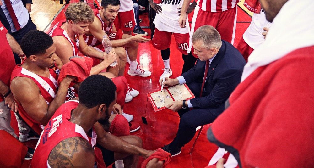 Ο Κεστούτις Κεμζούρα δίνει οδηγίες στους παίκτες του Ολυμπιακού κατά τη διάρκεια ενός τάιμ άουτ στον αγώνα με τη Βαλένθια. Eurokinissi Sports
