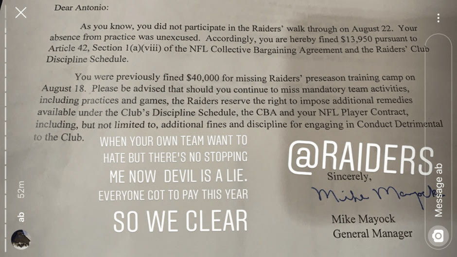 Κατόπιν αυτού του post, οι Raiders έκαναν νέα σύσκεψη και αποφάσισαν πως επειδή τα κρίματα του Μπράουν έχουν μαζευτεί πολλά, πλέον μένουν οι λεπτομέρειες για να μη πληρώσουν τα 30.125.000 δολάρια του συμβολαίου του. Και να λήξουν τη συνεργασία τους.