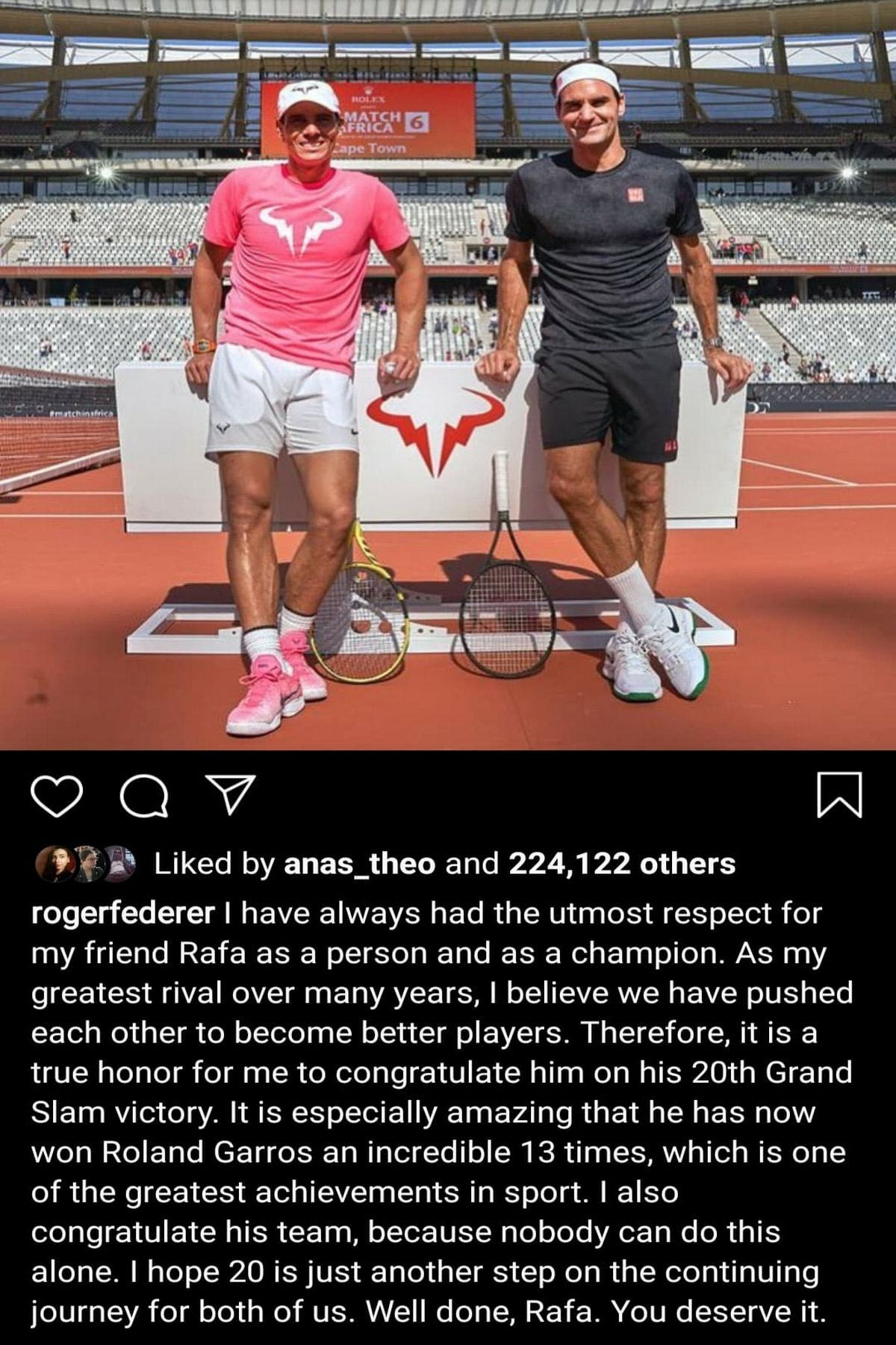 Από το πρώτο σετ, κιόλας, ο Φέντερερ πρέπει να σκεφτόταν το tweet συγχαρητηρίων του. Ούτως ή άλλως, όμως, έχει συμφιλιωθεί με την ιδέα πως πριν τελειώσει τη δική του καριέρα η πρωτιά θα έχει χαθεί. Ο Ναδάλ κράτησε τον Τζόκοβιτς σε μια απόσταση τριών Major και κάθε τέτοια πρόταση απλώς επιβεβαιώνει το μεγαλείο των τριών στο τένις, που έχει σβήσει οποιονδήποτε άλλον σε παρελθοντικό χρόνο*.