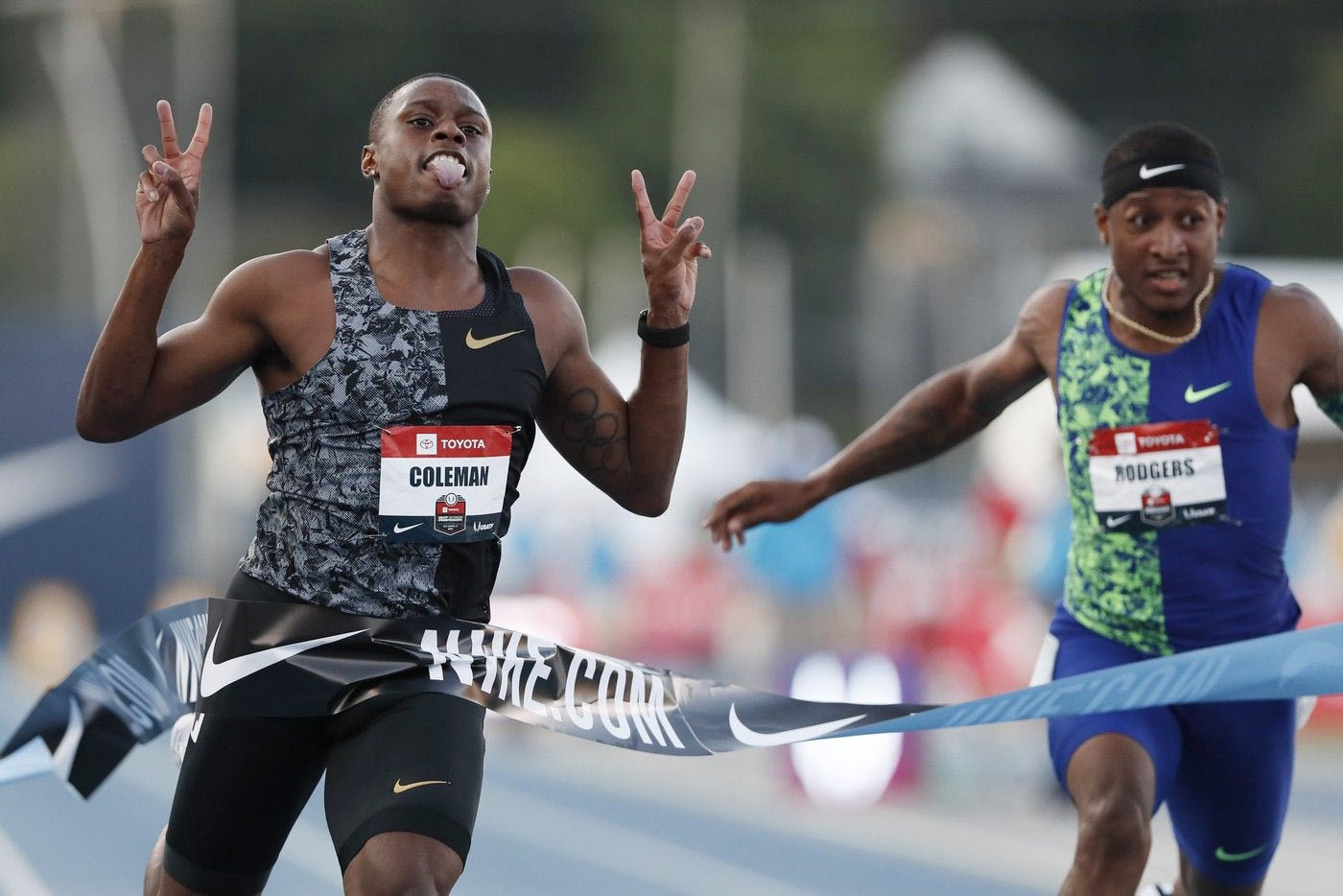 O Κρίστιαν Κόουλμαν (αριστερά) κερδίζει στο νήμα τον Μάικλ Ρότζερς (δεξιά), στο αγώνισμα των 100μ., για το εθνικό πρωτάθλημα στίβου των ΗΠΑ, που έγινε την Παρασκευή 26 Ιουλίου 2019, στο Ντε Μουάν της Αϊόβα AP Photo/Charlie Neibergall