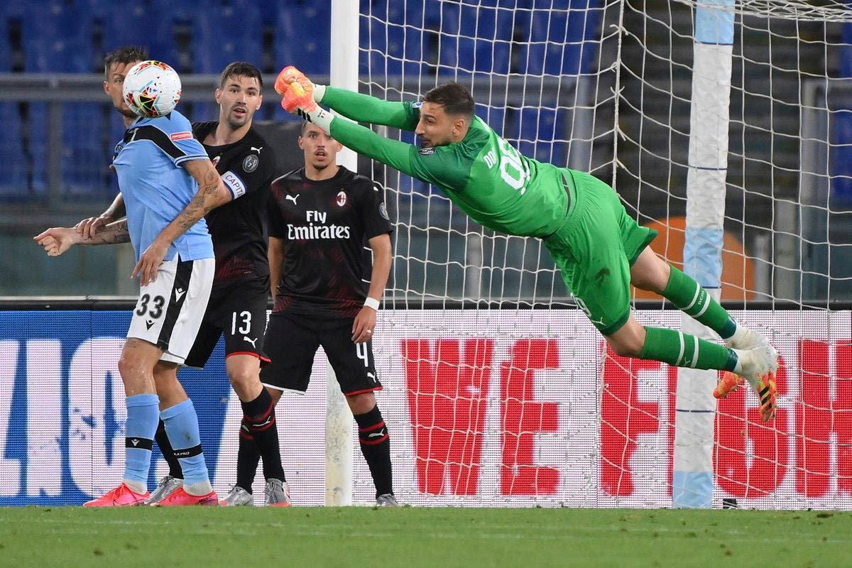 Ο Τζιανλουίτζι Ντοναρούμα της Μίλαν σε στιγμιότυπο της αναμέτρησης με τη Λάτσιο για τη Serie A 2019-2020 στο 'Ολίμπικο' της Ρώμης | Σάββατο 4 Ιουλίου 2020 LaPresse via AP/Alfredo Falcone