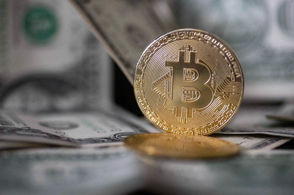 Bitcoin golden physical coin illustration on United States Dollar banknotes. Visual representations of the digital Cryptocurrency Bitcoin with the USD bill. Bitcoin with the symbol BTC, XBT is a popular digital currency that showed growth and is widely spread, accepted from banks, markets and other services and shops as ways of payments. The exchange rate today for 1 bitcoin blockchain is 32.287 US Dollar. The value of the cryptocurrency bitcoin has surged to a record high in 2021, reaching $63,000 according to American Financial media. Thessaloniki, Greece on July 23, 2021 (Photo by Nicolas Economou/NurPhoto) (Photo by Nicolas Economou / NurPhoto / NurPhoto via AFP)