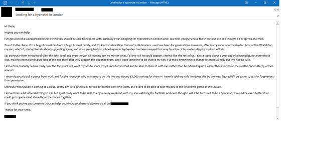 Ο πατέρας, οπαδός της Άρσεναλ, επιχείρησε να ανεβάσει μια αγγελία στο site Bark.com, όπου μεταξύ άλλων ανέφερε πως όντας απογοητευμένος από το σπάσιμο της οικογενειακής παράδοσης καθολικής υποστήριξης της Άρσεναλ, αποφάσισε να ζητήσει τη βοήθεια ενός ειδικού, ενός υπνωτιστή που να πείσει τον εξάχρονο γιο του να μην υποστηρίζει την Τότεναμ.