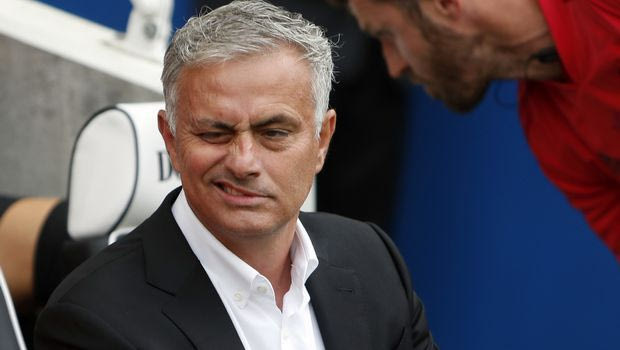 Manchester United's manager Jose Mourinho grimaces as he takes his seat for the English Premier League soccer match between Brighton and Hove Albion and Manchester United at the Amex stadium in Brighton, England, Sunday, Aug. 19, 2018. (AP Photo/Alastair Grant)