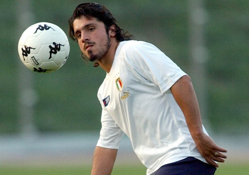 Ο Γκατούζο στην διάρκεια μιας προπόνησης με την εθνική Ιταλίας στην πόλη Celje, πριν από παιχνίδι με την Σλοβενία για την προκριματική φάση του Παγκοσμίου Κυπέλλου 2004 (AP Photo/Darko Bandic)