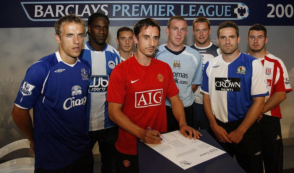 Φιλ Νέβιλ, Γκάρι Νέβιλ, Μάριο Μέλχιοτ, Φάμπιο Αουρέλιο, Ρίτσαρντ Νταν, Κέβιν Νόλαν, Ντέιβιντ Νταν και Άντι Γκρίφιν φωτογραφίζονται στο Blackburn Rovers Sports Arena, πριν την έναρξη της Premier League 2008/2009 (AP Photo/Paul Thomas)