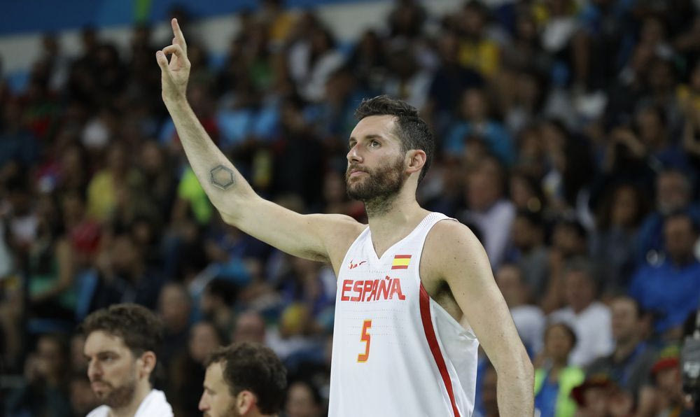 O Ρούντι Φερνάντεθ πανηγυρίζει με την φανέλα της Ισπανίας με αντίπαλο την Λιθουανία στους Ολυμπιακούς Αγώνες του Rio de Janeiro της Βραζιλίας (AP Photo/Charlie Neibergall)