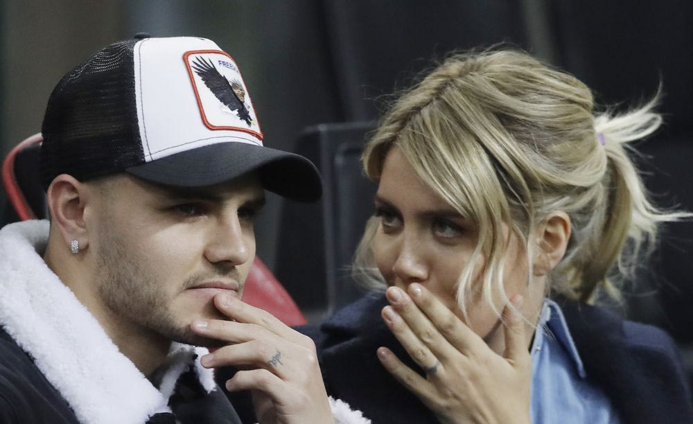 Μάουρο Ικάρντι και Γουάντα Νάρα στις εξέδρες του San Siro, στην αναμέτρηση της Ίντερ με την Ραπίντ Βιέννης για την φάση των 32 του Europa League στις 21/02/2019 (AP Photo/Luca Bruno)