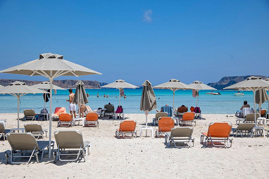Balos Beach, the incredible lagoon, with the pool like turquoise exotic and tropical water of the Mediterranean sea is located in Chania region in Crete Island. Balos is one of the most visited beaches in Crete and popular for visitors around the world. Crystal clear water, the lagoon, rocky steep mountains, a beach bar providing umbrellas and shadow with beverages and a pirate island are located at the same region that is accessible by a 20 min trek or boat. Greece is trying to boost its tourism and give privileges to vaccinated against Covid-19 Coronavirus pandemic international tourists and locals, as the country is heavily depended from the tourism industry. In July 2021 Greece is considering to bring back safety measures against the spread of the Delta Variant Mutation of the virus as there is a spike in cases. Balos, Chania, Greece on June 13, 2021 (Photo by Nicolas Economou/NurPhoto) (Photo by Nicolas Economou / NurPhoto / NurPhoto via AFP)