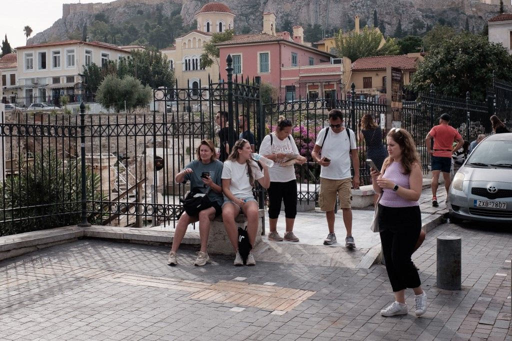 Tourists enjoy their time at Monastiraki square in the center of Athens, Greece on October 25, 2023. (Photo by Nikolas Kokovlis/NurPhoto) (Photo by Nikolas Kokovlis / NurPhoto / NurPhoto via AFP)