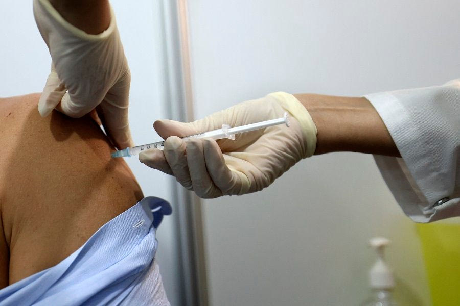 A health worker injects a man with a dose of the Pfizer-BioNTech vaccine against the coronavirus, at a vaccination centre set up at the Dubai International Financial Center in the Gulf emirate of Dubai, on February 3, 2021. - The United Arab Emirates, which includes Dubai and six other emirates, has suffered a spike in cases after the holiday period. It was among the first to launch a vast vaccination campaign in December 2020 for its population of nearly 10 million and has administered at least three million doses to more than a quarter of its population, second only to Israel in the global race, according to the German data agency Statista. (Photo by Karim SAHIB / AFP)