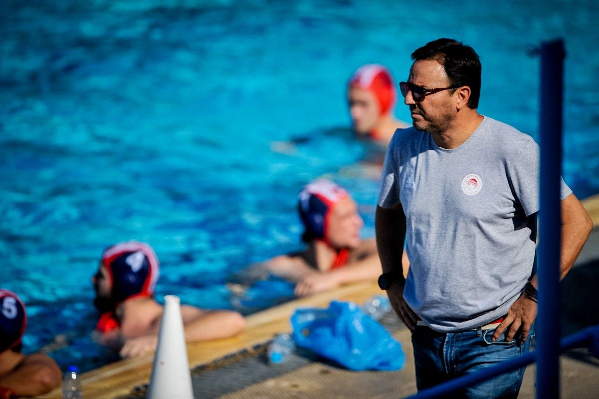 Ο προπονητής του Ολυμπιακού, Θοδωρής Βλάχος, σε στιγμιότυπο της αναμέτρησης με τον ΝΟ Χανίων για την Α1 πόλο 2020-2021 στο κολυμβητήριο των Χανίων | Σάββατο 24 Οκτωβρίου 2020 Eurokinissi Sports/Γιώτα Κορμπάκη