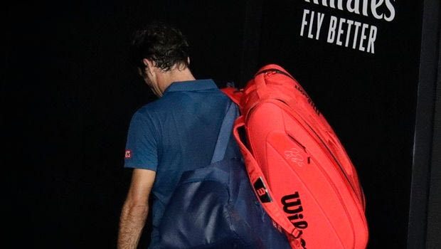 Switzerland's Roger Federer leaves Rod Laver Arena after losing his fourth round match against Greece's Stefanos Tsitsipas at the Australian Open tennis championships in Melbourne, Australia, Sunday, Jan. 20, 2019.(AP Photo/Aaron Favila)