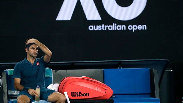 Switzerland's Roger Federer sits in his chair during a break in his fourth round match against Greece's Stefanos Tsitsipas at the Australian Open tennis championships in Melbourne, Australia, Sunday, Jan. 20, 2019. (AP Photo/Mark Schiefelbein)