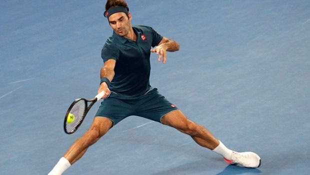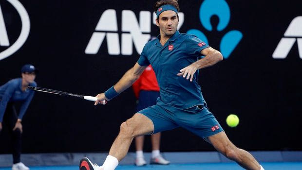 Switzerland's Roger Federer makes a forehand return to Greece's Stefanos Tsitsipas during their fourth round match at the Australian Open tennis championships in Melbourne, Australia, Sunday, Jan. 20, 2019. (AP Photo/Mark Schiefelbein)