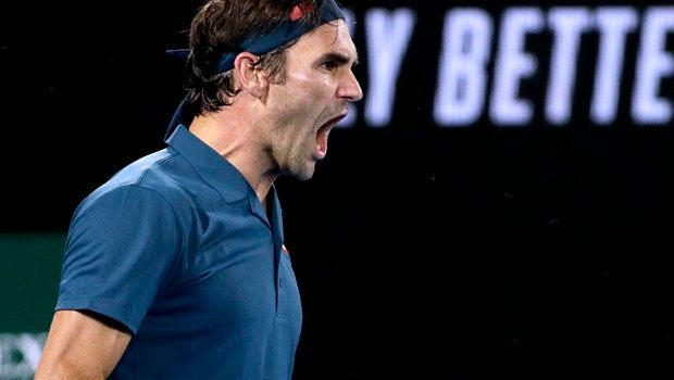 Switzerland's Roger Federer reacts during his fourth round match against Greece's Stefanos Tsitsipas at the Australian Open tennis championships in Melbourne, Australia, Sunday, Jan. 20, 2019. (AP Photo/Mark Schiefelbein)