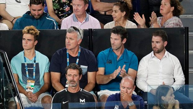Serena Williams' coach, Patrick Mouratoglou, bottom left, sits in the player box of Greece's Stefanos Tsitsipas during his fourth round match against Switzerland's Roger Federer at the Australian Open tennis championships in Melbourne, Australia, Sunday, Jan. 20, 2019. (AP Photo/Aaron Favila)