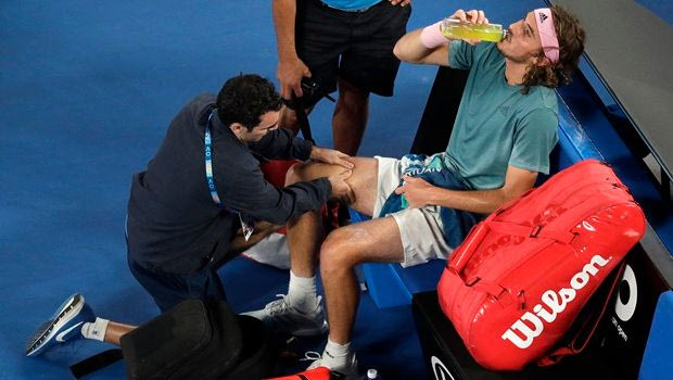 Greece's Stefanos Tsitsipas receives treatment from a trainer during his fourth round match against Switzerland's Roger Federer at the Australian Open tennis championships in Melbourne, Australia, Sunday, Jan. 20, 2019. (AP Photo/Kin Cheung)