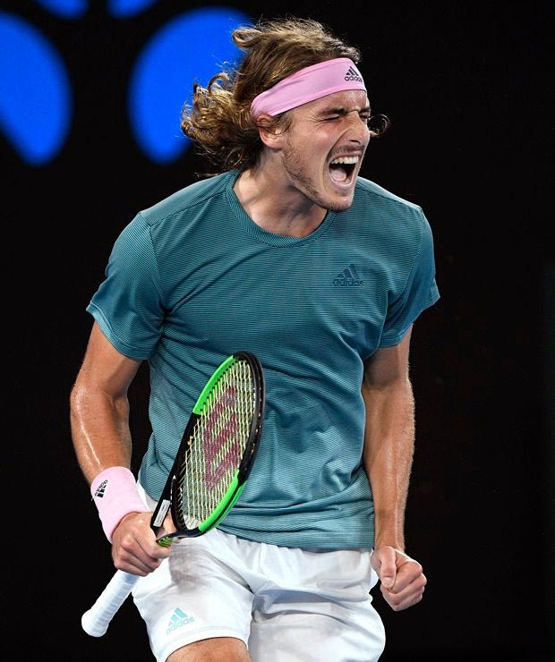 Greece's Stefanos Tsitsipas celebrates a point win over Switzerland's Roger Federer during their fourth round match at the Australian Open tennis championships in Melbourne, Australia, Sunday, Jan. 20, 2019. (AP Photo/Andy Brownbill)