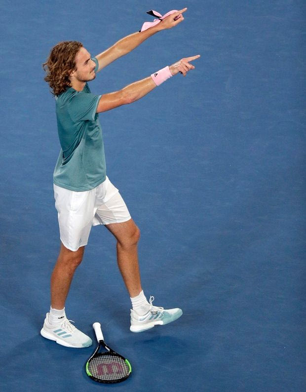 Greece's Stefanos Tsitsipas celebrates after defeating Switzerland's Roger Federer in their fourth round match at the Australian Open tennis championships in Melbourne, Australia, Sunday, Jan. 20, 2019.