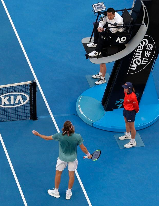 Greece's Stefanos Tsitsipas argues with the chair umpire during his fourth round match against Switzerland's Roger Federer at the Australian Open tennis championships in Melbourne, Australia, Sunday, Jan. 20, 2019. (AP Photo/Aaron Favila)