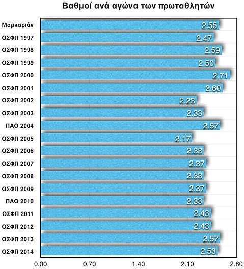 Ο Παναθηναϊκός με τον Μαρκαριάν κέρδισε έντεκα περισσότερους βαθμούς από έναν Ολυμπιακό που ζούσε την εποχή της "δυναστείας" του Κόκκαλη, χωρίς μάλιστα να τον νικήσει στα καθοριστικά ντέρμπι στο τέλος της σεζόν που έκριναν τους δύο τίτλους.