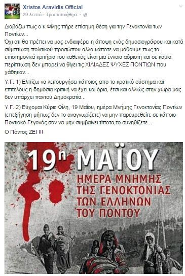 Η δήλωση του Νίκου Φίλη για τη γενοκτονία των Ποντίων προκάλεσε την αντίδραση του Χρήστου Αραβίδη, ο οποίος με μία "αιχμηρή" ανάρτηση στο facebook έδωσε την απάντησή του στο Υπουργό Παιδείας. Δείτε τη PHOTO.