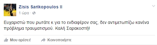 Ο σέντερ της ΑΕΚ, Ζήσης Σαρικόπουλος πήγε θέση, μέσω του λογαριασμού στο facebook, για τη μη συμμετοχή του στο παιχνίδι με τον Ολυμπιακό, αποκαλύπτοντας πως δεν αντιμετώπιζε κανένα πρόβλημα τραυματισμού.