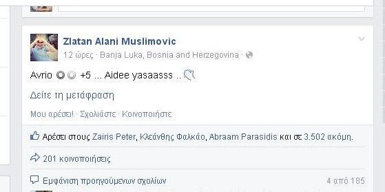 Ο Βόσνιος πρώην επιθετικός του ΠΑΟΚ, Ζλάταν Μουσλίμοβιτς, εκφράζεται αρκετά συχνά μέσω του προσωπικού του λογαριασμού στο facebook. Το ίδιο έκανε και μετά την ισοπαλία του Ολυμπιακού στην Τρίπολη, θέλοντας να τονίσει την ευκαιρία που έχει σήμερα (2/11) ο Δικέφαλος να πάρει διαφορά πέντε βαθμών από τους “ερυθρόλευκους”, νικώντας στην Κρήτη τον Εργοτέλη. “Αύριο +5…. Αντε γεια σας…” έγραψε συγκεκριμένα ο Μούσλι και όπως ήταν φυσιολογικό δέχτηκε καταιγισμο΄σχολίων από φίλους του ΠΑΟΚ…