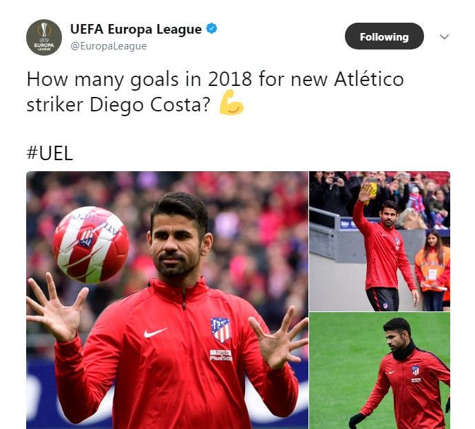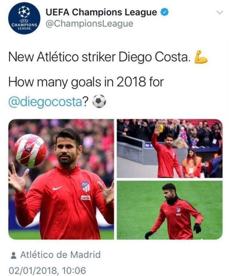 ” Ο νέος επιθετικός της Ατλέτικο, Ντιέγκο Κόστα. Πόσα γκολ θα πετύχει το 2018;”. Φυσικά το tweet έγινε αμέσως viral, μοιράστηκε σε χρόνο d.t. και όπως ήταν αναμενόμενο… εξαφανίστηκε.