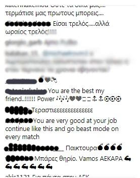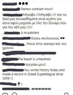 Πλέον η φωτογραφία που ανέβασε μετά το ματς γράφοντας στα ελληνικά: “Μεγάλη βραδιά η αποψινή. 50 συμμετοχές με την ΑΕΚ και χατ-τρικ!! Τα συναισθήματά μου δεν περιγράφονται”, γέμισε με σχόλια αποθέωσης.