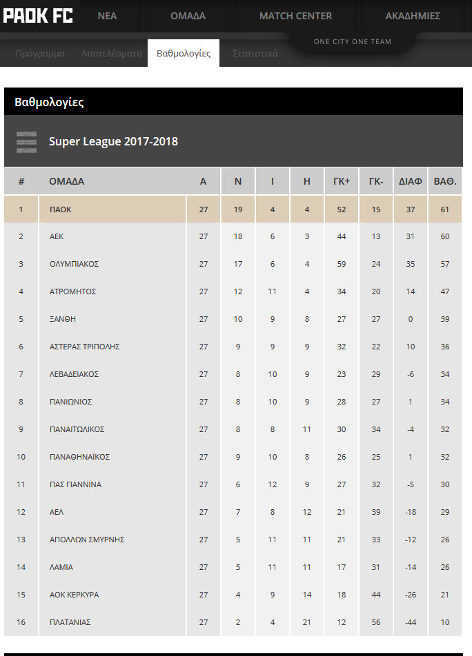 ΒΑΘΜΟΛΟΓΙΑ ΣΤΗΝ ΕΠΙΣΗΜΗ ΙΣΤΟΣΕΛΙΔΑ ΤΟΥ ΠΑΟΚ