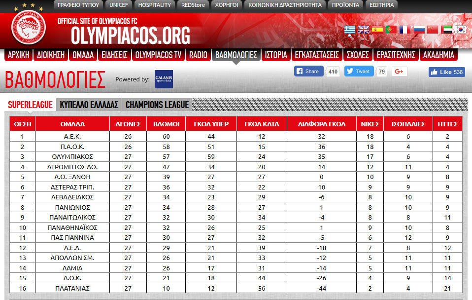 ΒΑΘΜΟΛΟΓΙΑ ΣΤΗΝ ΕΠΙΣΗΜΗ ΙΣΤΟΣΕΛΙΔΑ ΤΟΥ ΟΛΥΜΠΙΑΚΟΥ