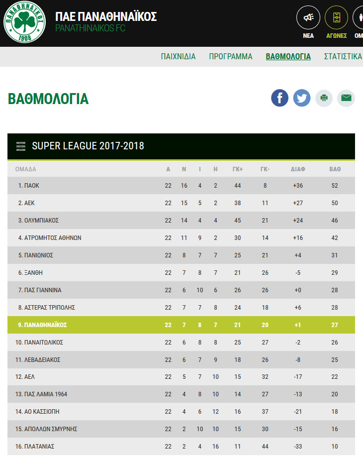 ΒΑΘΜΟΛΟΓΙΑ ΣΤΗΝ ΕΠΙΣΗΜΗ ΙΣΤΟΣΕΛΙΔΑ ΤΟΥ ΠΑΝΑΘΗΝΑΪΚΟΥ