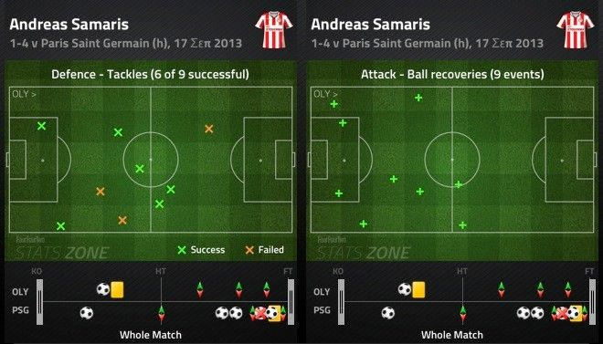 Είναι απ’τα πρόσωπα του αγώνα, κυρίως γιατί πέτυχε σε πράγματα που δεν μας έχει συνηθίσει. Στον Πανιώνιο διακρινόταν κυρίως για την τεχνική του, για την διάθεση να παίξει πολύ με την μπάλα, να απειλήσει με σουτ και στημένα και για την (σπάνια για Έλληνα μέσο) ικανότητα να χρησιμοποιεί εξίσου καλά και τα δύο πόδια. Ο Σάμαρης προσέφερε τρομερά ανασταλτικά (όσο είχε δυνάμεις) και δικαιούται κρέντιντ γι’αυτό. Είχε τα περισσότερα κερδισμένα τάκλινγκ (6/9) και ήταν αυτός που ξεκίνησε τις περισσότερες κατοχές (9) για τον Ολυμπιακό, ήταν εκεί δηλαδή μετά από μονομαχία για να πασάρει σε συμπαίκτη.