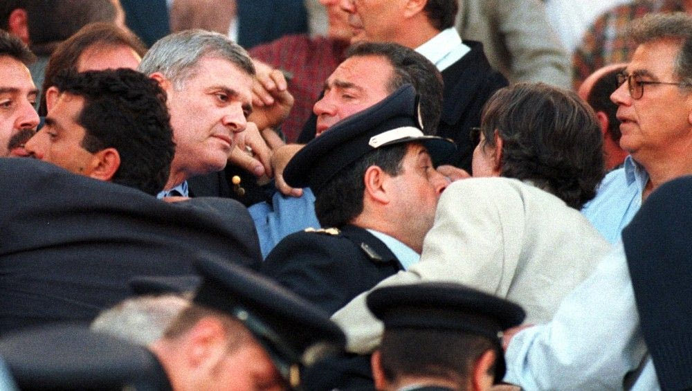 Όπως… τότε, πριν από 18 χρόνια (Μάιος του ’99 ήταν) όταν στο ντέρμπι Παναθηναϊκός-ΑΕΚ 0-0, που έκρινε τη δεύτερη θέση στο πρωτάθλημα, είχαν εμπλακεί στο “χοντρό” επεισόδιο που στήθηκε στα επίσημα του ΟΑΚΑ.