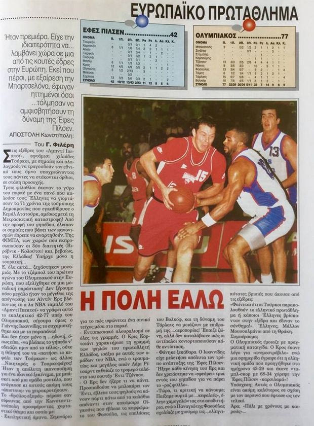 Ο Ολυμπιακός έκανε θραύση κερδίζοντας 40 ριμπάουντ, έναντι 23, έχοντας Βολκόφ, Τάρλατς και Φασούλα σε οργιαστική μέρα, ενώ ο Έντι Τζόνσον στο πρώτο του ευρωπαϊκό ματς σκόραρε 13 πόντους με 2/6 τρίποντα. “Πέρασαν από πάνω μας σαν οδοστρωτήρας” είπε ο Ρέτζι Κρος, ένας από τους δυο ξένους της Εφές εκείνη τη χρονιά. Ο άλλος ήταν ο Κρις Κορτσιάνι, που παραδεχόταν ότι η φροντ-λάιν του Ολυμπιακού δεν είχε να ζηλέψει τίποτε από αντίστοιχες ομάδων του ΝΒΑ. Δεν ήταν καθόλου κακή ομάδα Εφές Πίλσεν, με ισχυρή βάση Τούρκων παικτών (Τουρκσάν, Οϊγκούτς, Μπεσόκ, Σαριτσά) και κόους τον Αϊντίν Ερς.