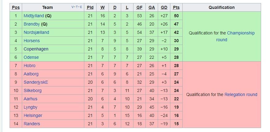 Βλέπετε, στην Δανία μετά την ολοκλήρωση της κανονικής περιόδου έχουμε μπαράζ. Για τον πρωταθλητή, την Ευρώπη και τον υποβιβασμό. Οι έξι πρώτοι παίζουν για τον τίτλο και τις διοργανώσεις της UEFA, ενώ οι υπόλοιποι οκτώ χωρίζονται σε δυο ομίλους των τεσσάρων.